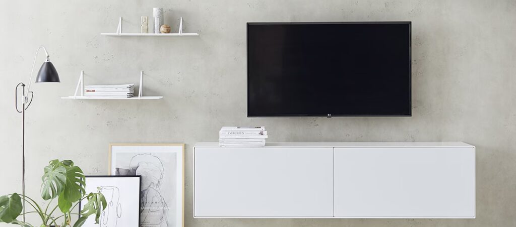 - Væghængt TV-bord: Et væghængt møbel skaber et svævende og let udtryk. Det er en fantastisk løsning for at gøre rengøringen under møblet nemmere og for at skabe en illusion af mere gulvplads. Det kræver dog en solid væg at montere på.